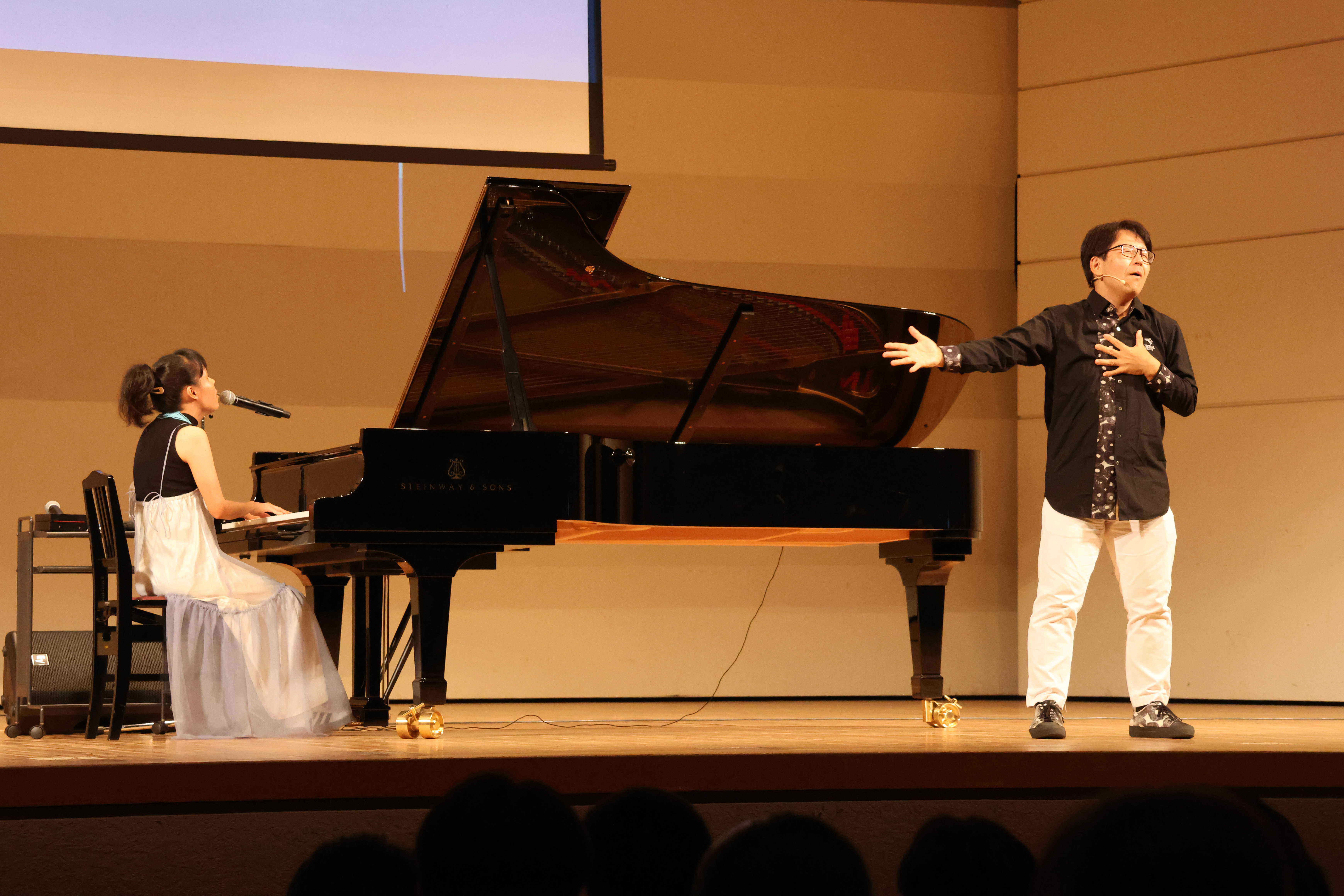 と き : 令和6年9月11日(水) ところ : 二戸市民文化会館大ホール(二戸市) 対 象 : 市内中学生(全員) 二戸市にゆかりのあるシンガーわたなべちひろ氏と手話アーティストの橋本一郎氏をお招きし、コン サートを実施しました。わたなべ氏の温かい演奏に会場は包まれました。また、視覚障がいにまつわる 内容の講演や本物の手話を体感したことで障がいを身近に感じる機会となりました。