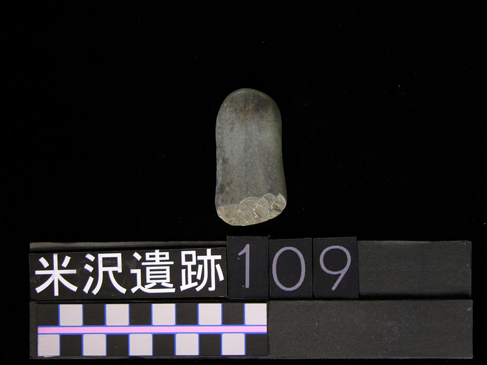 石斧。直接打撃により刃部を作り出しているので打製石斧としてもよいと思われる。石質=頁岩